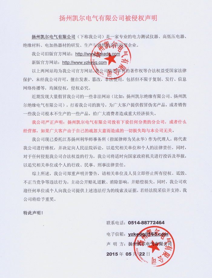 揚(yáng)州凱爾電氣有限公司(下稱我公司)是一家專業(yè)的電力測(cè)試儀器、高低壓電器、絕緣材料、電加熱器材的研發(fā)、生產(chǎn)與銷售的高科技型企業(yè)。 我公司舊版官方網(wǎng)站:http://www.heyxhb.com 新版官方網(wǎng)站:http://www.yzkeyq.com 以上兩網(wǎng)站均為我公司官方網(wǎng)站。我公司依法享有的著作權(quán)等合法權(quán)益受國(guó)家法律保護(hù),未經(jīng)我公司許可,擅自發(fā)表、篡改,非法使用,包括但不限于復(fù)制、發(fā)行、信息網(wǎng)絡(luò)傳播等,均屬侵權(quán),侵權(quán)必究。 近期發(fā)現(xiàn)大量假冒我公司的一些非法網(wǎng)站(比如:揚(yáng)州凱爾絕緣有限公司、揚(yáng)州凱爾絕緣電氣有限公司),打著我公司的旗號(hào),為廣大客戶提供假冒偽劣產(chǎn)品,或者銷售一些我公司根本不生產(chǎn)的一些產(chǎn)品,給廣大消費(fèi)者造成重大經(jīng)濟(jì)損失。在此,我公司嚴(yán)正聲明:揚(yáng)州凱爾電氣有限公司沒有下設(shè)任何分類的分公司,或者什么經(jīng)營(yíng)部。 我公司現(xiàn)已委托江蘇揚(yáng)州光華師事務(wù)所(指派律師為吳永輝)作為代理人,將代表我公司進(jìn)行維權(quán),并決定向人民法院訴訟,以追究相關(guān)單位和個(gè)人的法律責(zé)任。同時(shí),對(duì)于任何侵犯我公司合法權(quán)益的行為,我公司將適時(shí)向國(guó)家政府機(jī)關(guān)進(jìn)行投訴及舉報(bào),以追究相關(guān)單位和個(gè)人的行政、刑事法律責(zé)任。 綜上所述,我公司鄭重聲明并警告,請(qǐng)相關(guān)單位及人員立即停止所有侵權(quán)、詆毀、不正當(dāng)競(jìng)爭(zhēng)等違法行為,主動(dòng)公開賠禮道歉、消除影響,并賠償損失。同時(shí),我公司歡迎任何單位及人員向我公司提供上述違法行為的線索及證據(jù),若經(jīng)法院采信并支持,我公司將給予重獎(jiǎng)。