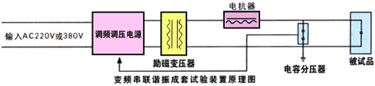 電抗器L和被試品電容C組成的串聯(lián)諧振都有一個固定的諧振頻率F=1/(2π√L·C)當試驗頻率等于這個頻率時,該電路發(fā)生諧振。通過這個原理,由調(diào)頻電源提供電源送給勵磁變壓器,經(jīng)過勵磁變壓器變壓成中壓加上L和被試品電容C上。通過改變調(diào)頻電源輸出頻率,使回路處于串聯(lián)諧振狀態(tài),再調(diào)節(jié)調(diào)頻電源輸出電壓,使試品上電壓達到所需要的電壓值。